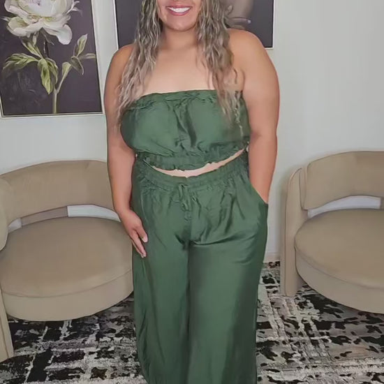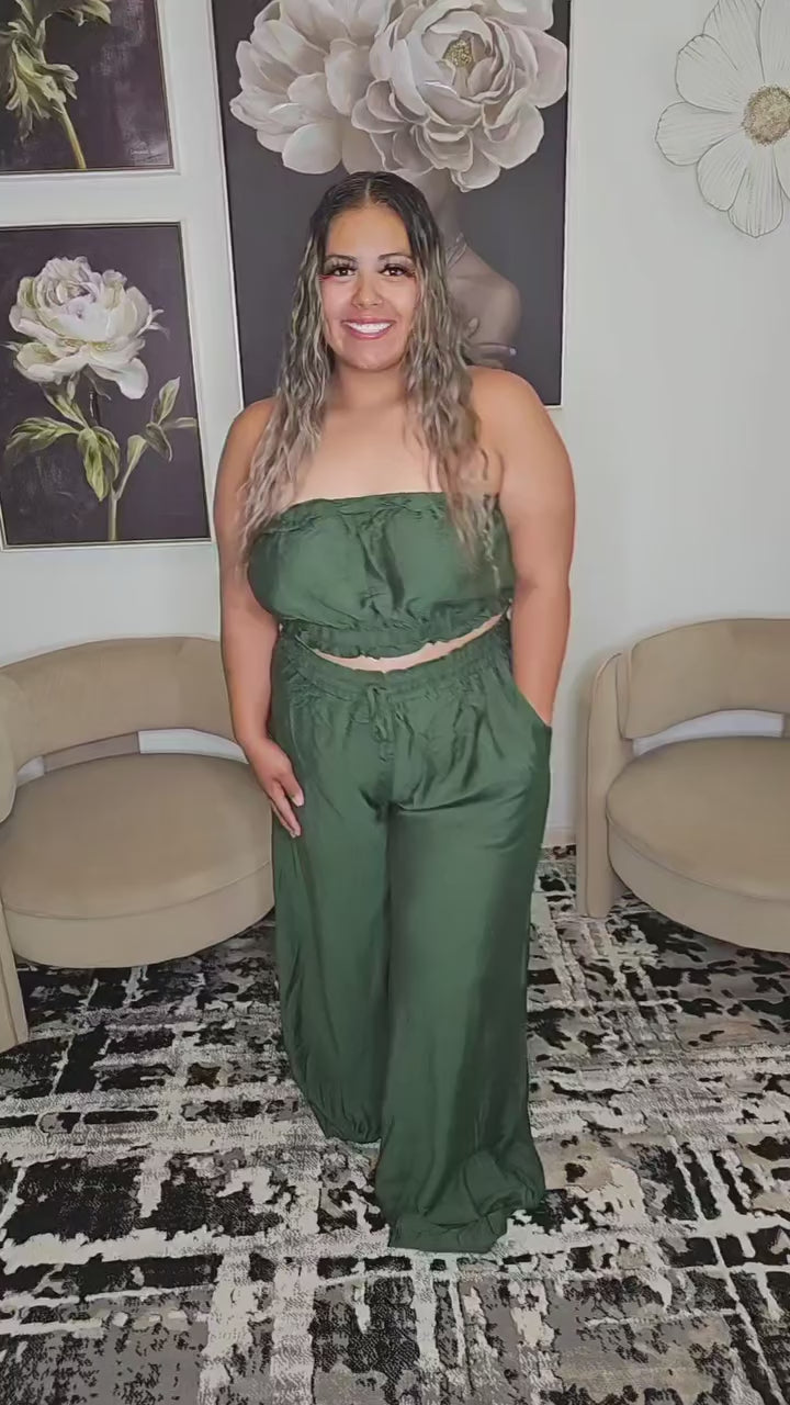 This chic and comfortable plus-size set features a shirred tube top paired with flowy palazzo pants for an effortlessly put-together look. Whether you're heading to brunch, a vacation, or just enjoying a stylish day out, this versatile combo delivers fashion and ease.